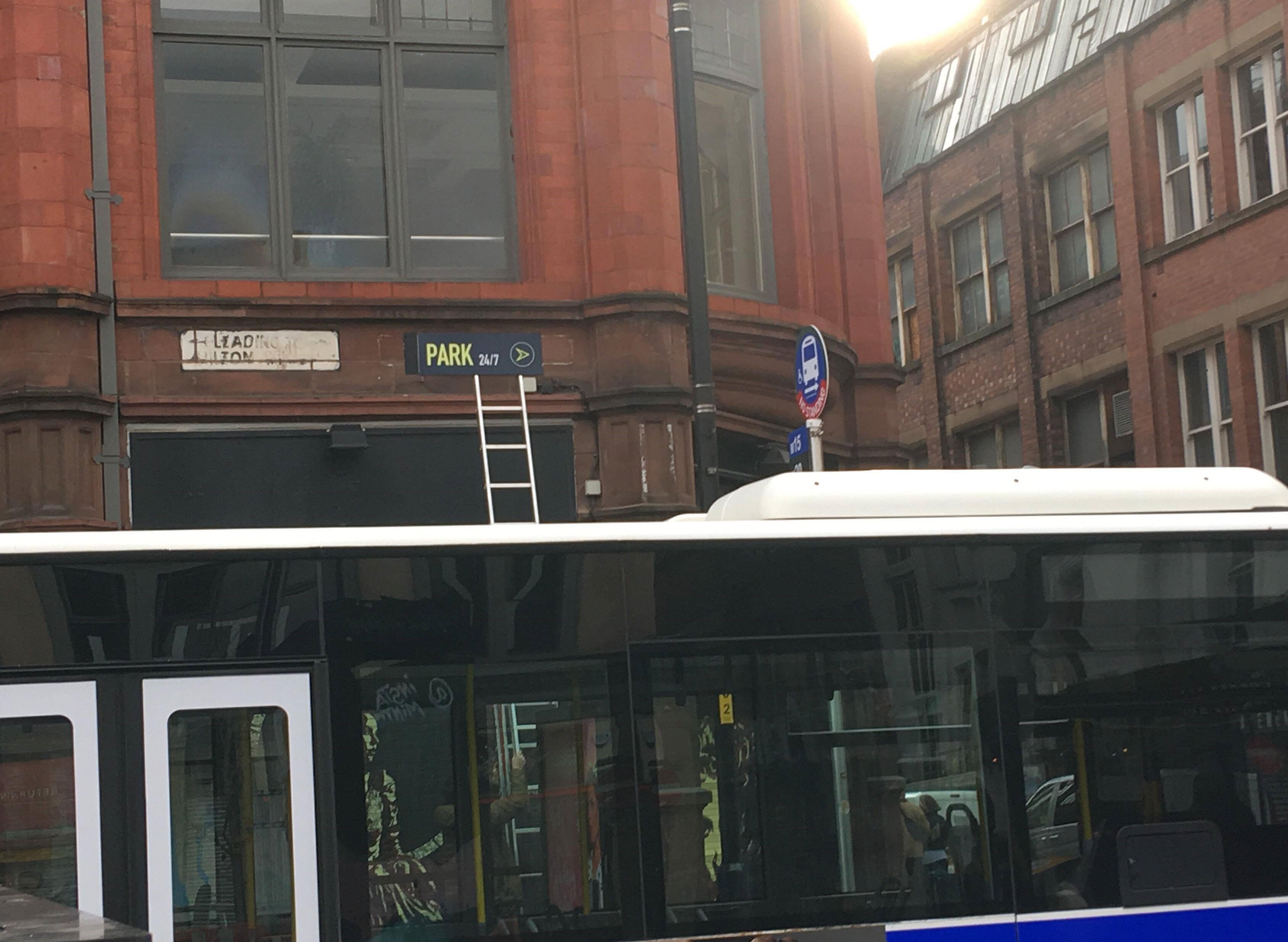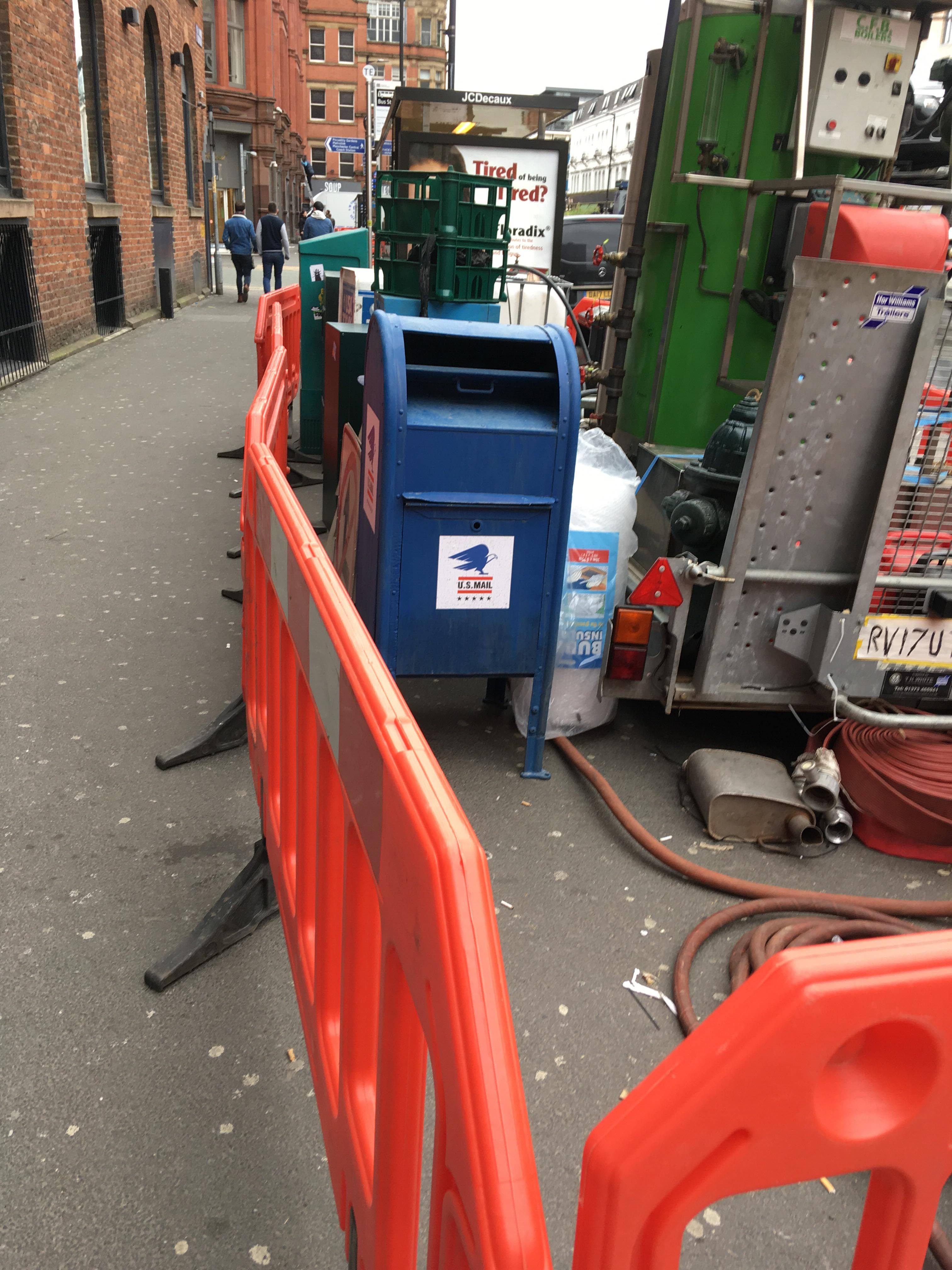 As you can see in the photos below, an American-style bus is currently parked outside Stevenson Square, plus a few bits of set decoration are knocking around, including signs and a mail box.