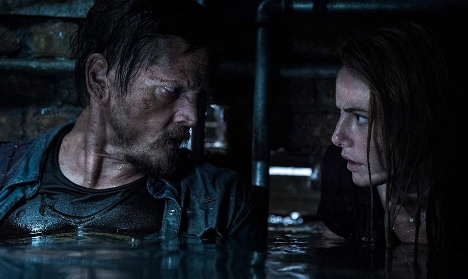 28mins – Scodelario and her dad – played by Barry Pepper – are trapped in the basement of the house. Pepper is injured, and the alligator is lurking.