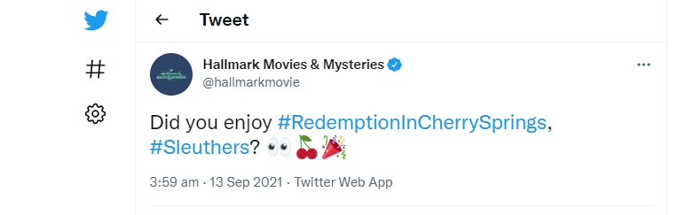 At various points during the broadcast of Redemption in Cherry Springs, the Hallmark Movies & Mysteries Twitter account posed questions to followers about certain plot developments and re-tweeted their responses. Fans were even asked to make “final predictions” on the central mystery, as the movie neared its conclusion.