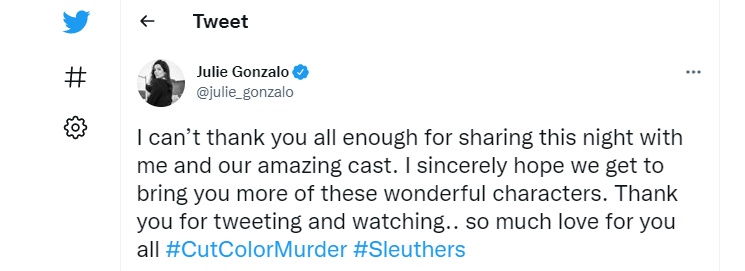 As part of the premiere screening on Sunday night, stars of Cut, Color, Murder, Julie Gonzalo, Ryan McPartlin and Rebecca Staab, took to Twitter to tweet along with the new movie, and to interact with fans. This gave them the opportunity to see the response the movie was generating, offering an indication of just how well the movie was being received.