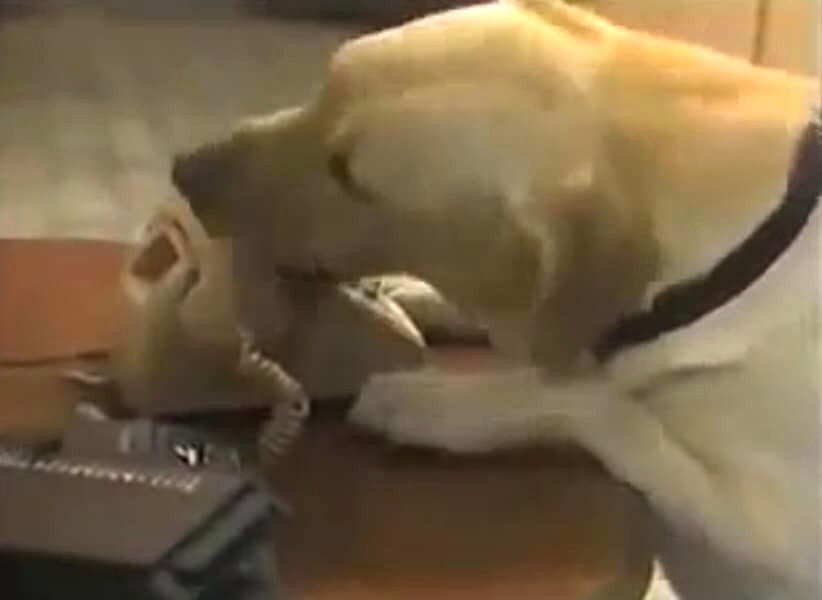 But just as disaster is about to strike, the phone rings, Bouncer the dog ANSWERS THE PHONE, and manages to bark for help! Yep, he BARKS FOR HELP… THROUGH A TELEPHONE.
