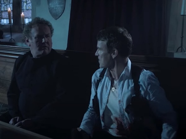 With blood pouring out of his chest, Victor orders Father Peter to lock all of the doors. Father Peter complies with the request, and soon the pair engage in conversation, with the priest trying to get a better understanding of who Victor is.