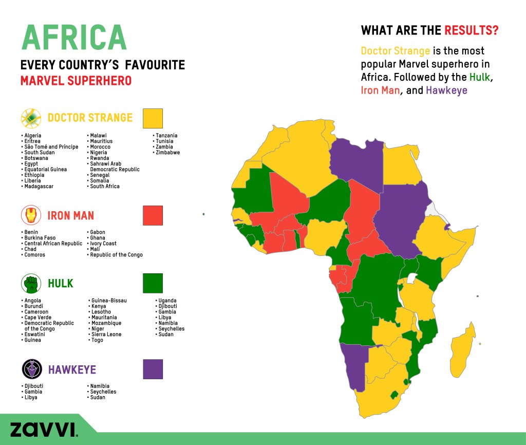 First up on the list is Africa, where Doctor Strange ranks as the most popular MCU hero, with 36% of Marvel Google searches focused on this character. The character also reigns supreme in Asia, where Doctor Strange is the most-searched-for MCU hero in 27 countries on this continent, beating out any other Avenger.