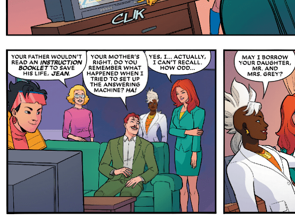Moving on from the news report, and as Jubilee switches off the television, Jean Grey’s parents can be seen watching the TV. During this sequence, Jean’s father begins to tell an anecdote about the past, making reference to an old answering machine he once tried to program.