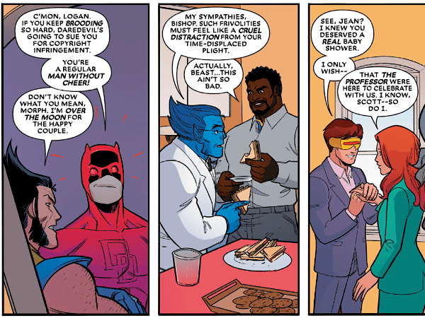 Onto a quick cameo now, and as the X-Men gather together to celebrate the news that Jean Grey and Cyclops are expecting their first child, Morph transforms into the blind superhero, Daredevil.