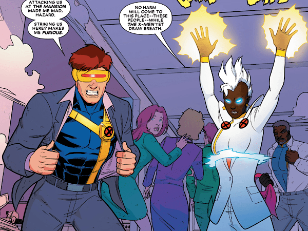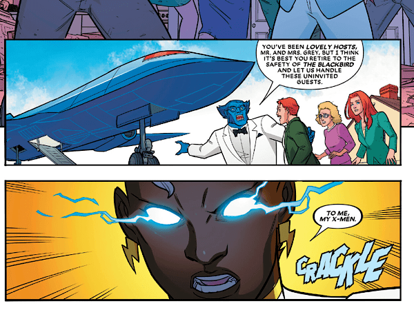 Although this should be a time of celebration for the X-Men, things don’t go according to plan and the team are interrupted by an attack from Siena Blaze, Hazard, and The Marauders – a trio of villains who appeared in previous issues. As the X-Men respond to the attack, Storm can be seen transforming from her regular attire into her superhero costume, almost in the blink of an eye.