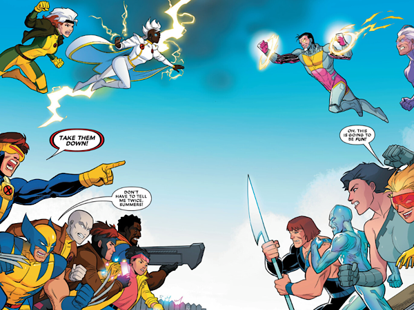 As the X-Men head into battle against the gang of villainous mutants, a double-page spread shows the X-Men on one side (the left), and The Marauders, Siena Blaze, and Hazard on the other (the right). This whole spread is a nod to the opening titles of X-Men: The Animated Series and X-Men ‘97, where a similar scene sees the X-Men locked in battle with Magneto and his hoard of evil mutants.