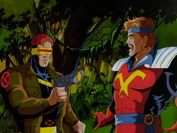 As the battle continues, Cyclops starts putting his leadership skills to good use, by reminding everyone they have trained for similar encounters in the Danger Room (the X-Men’s training room). He then utters the following piece of dialogue: “Bishop and Morph, get in the Corsair formation.”